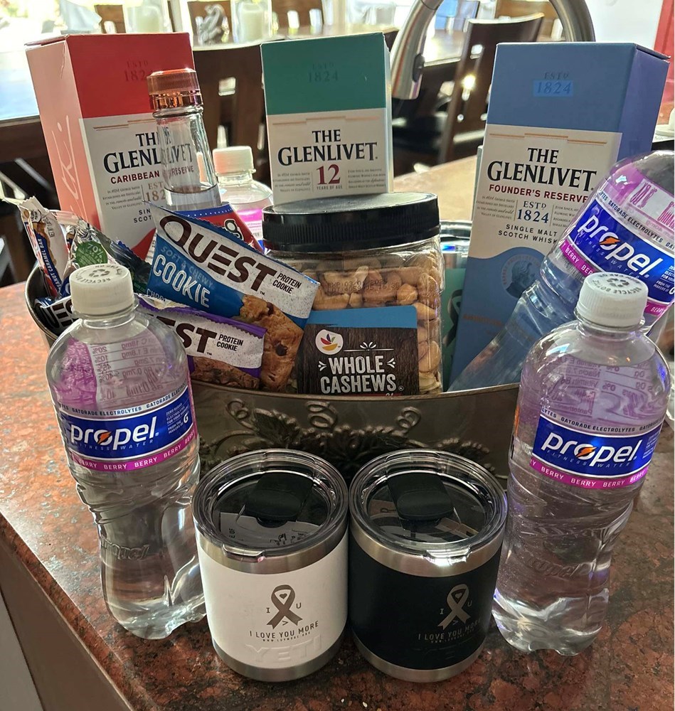 Some of Jan's Favorite food and beverage - Three (3) bottles of Glenlivet Scotch Whiskey, One (1) bottle of Tito's Vodka, Three (3) Yeti mugs, and various snacks. (no shipping option)