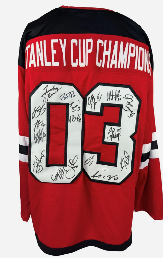 This is a 2003 Stanley Cup Champions team autographed custom stitched jersey that has been hand signed by Martin Brodeur, Joe Nieuwendyk, Scott Stevens, Scott Niedermayer, Patrik Elias, Jamie Langenbrunner, Brian Rafalski, Brian Gionta, Scott Gomez, Sergei Brylin, Ken Daneyko and Mike Rupp. Perfect for any collection. This comes with a certificate of authenticity from JSA. (COA included)