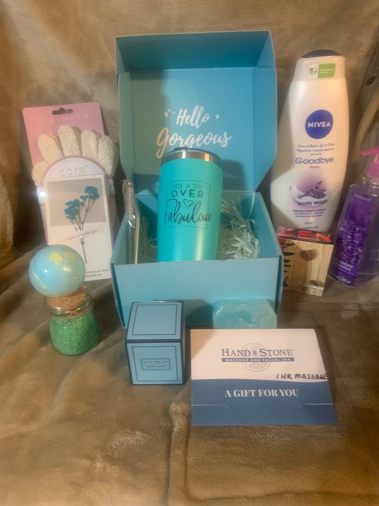 + Gift Card for 1 hour relaxing Hand & Stone massage at any location (retail value $138 including tax) + Hello Gorgeous Gift Box (with Bath Salts, Soap, Bath Bomb, ‘Not a Day over Fabulous Tumbler and straw, scented candle, and note card) + Zen Gardening Kit + Nivea Body Wash + Lavender Hand Soap + Bath Gloves + Pink Cloth Carrying Bag